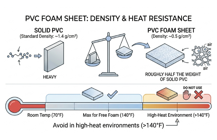 The standard density is around 0.5 g/cm³, which is roughly half the weight of solid PVC. Free foam boards can generally face temperatures up to 140°F, so you should generally avoid them in high-heat environments.