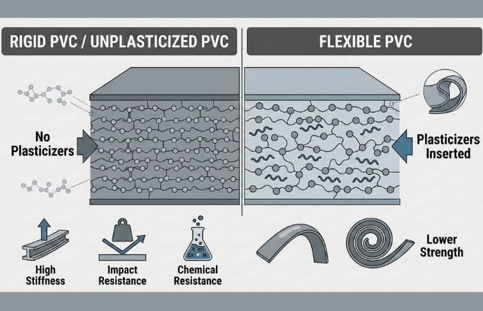 Then, semi-rigid PVC comes between rigid and flexible, which generally comes in the 10–25 phr plasticizer range. It is good to use semi-rigid PVC when you need a sheet that bends without cracking but still holds its shape under moderate load.