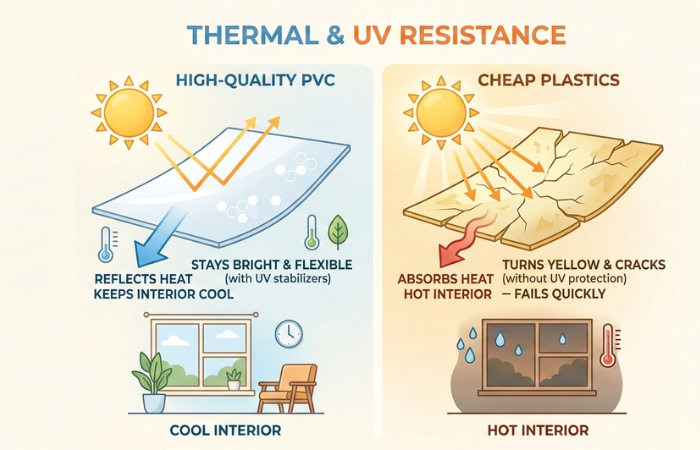 Sunlight kills most plastics. High-quality PVC has UV stabilizers. Without them, the sheet turns yellow and cracks after a few months. Same as always, cheap imports fail here. On the other hand, good sheets reflect heat and keep the interior cool.